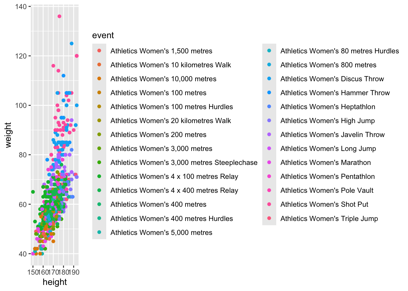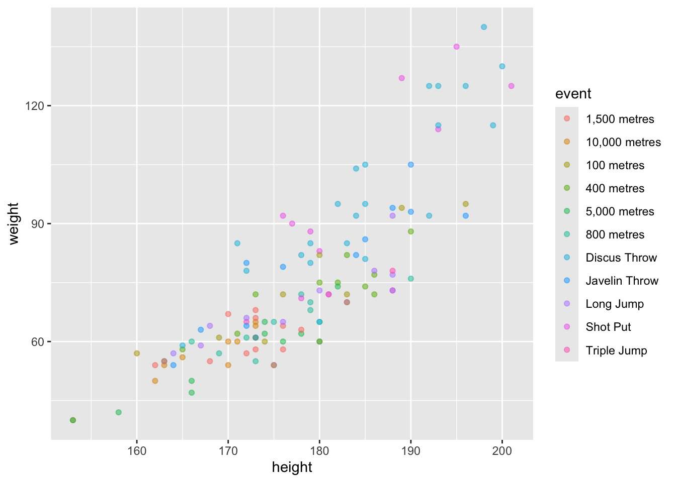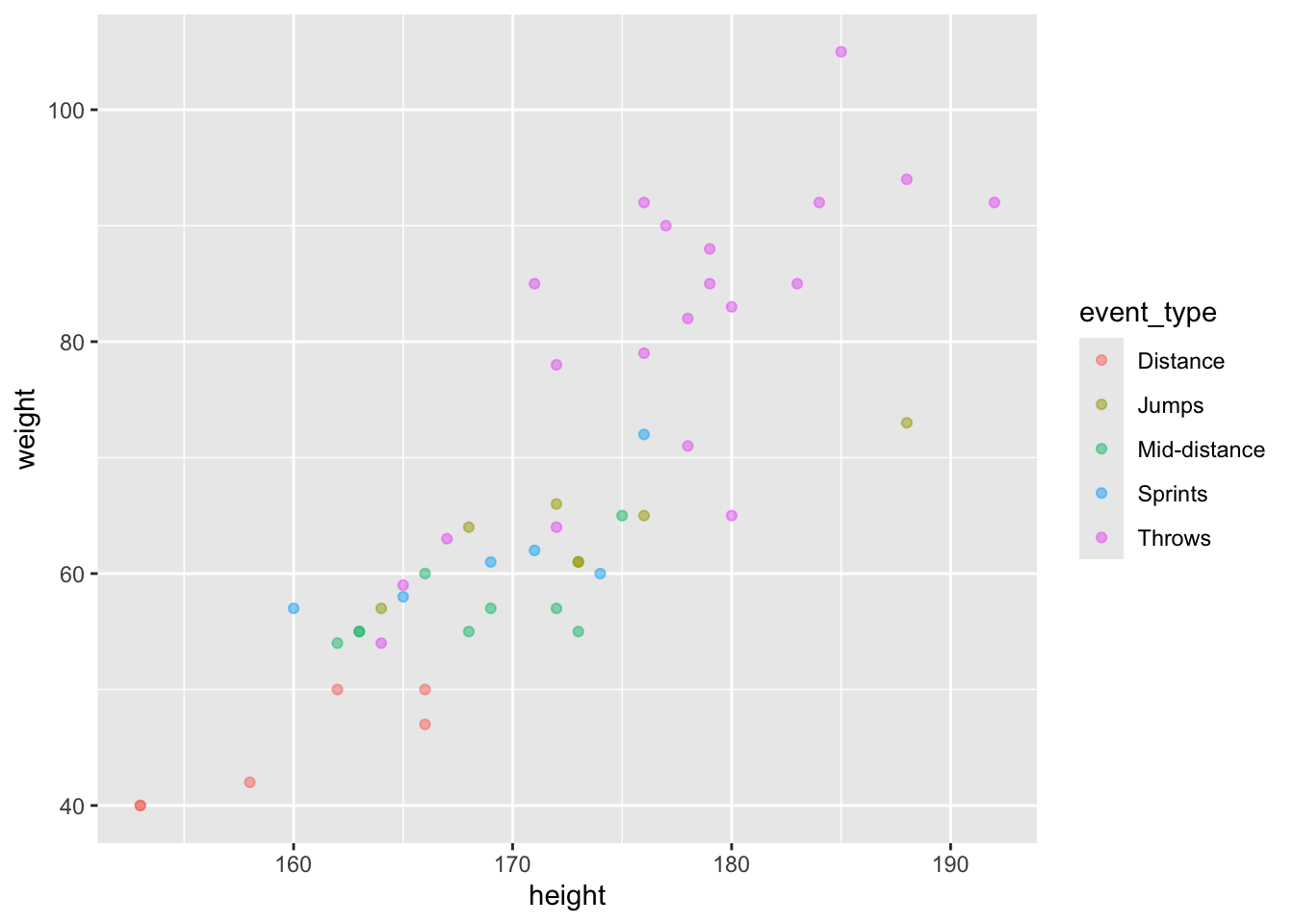 # this is still too much, let's group themathletics <- athletics %>%mutate(event_type =case_when( event %in%c("10,000 metres", "5,000 metres") ~"Distance", event %in%c("800 metres","1,500 metres") ~"Mid-distance", event %in%c("100 metres", "400 metres") ~"Sprints", event %in%c("Long Jump", "Triple Jump", "High Jump") ~"Jumps", event %in%c("Shot Put", "Discus Throw", "Javelin Throw") ~"Throws",))# now it's time to subset by sexathletics_f <- athletics %>%filter(sex=="F")athletics_m <- athletics %>%filter(sex=="M")# plot femaleathletics_f %>%ggplot(aes(height, weight, color=event_type))+geom_point(alpha=0.5)