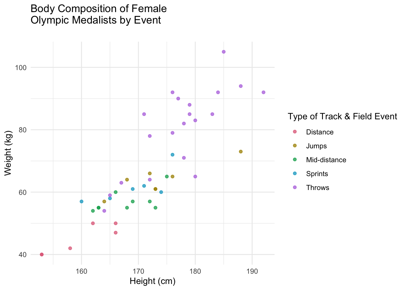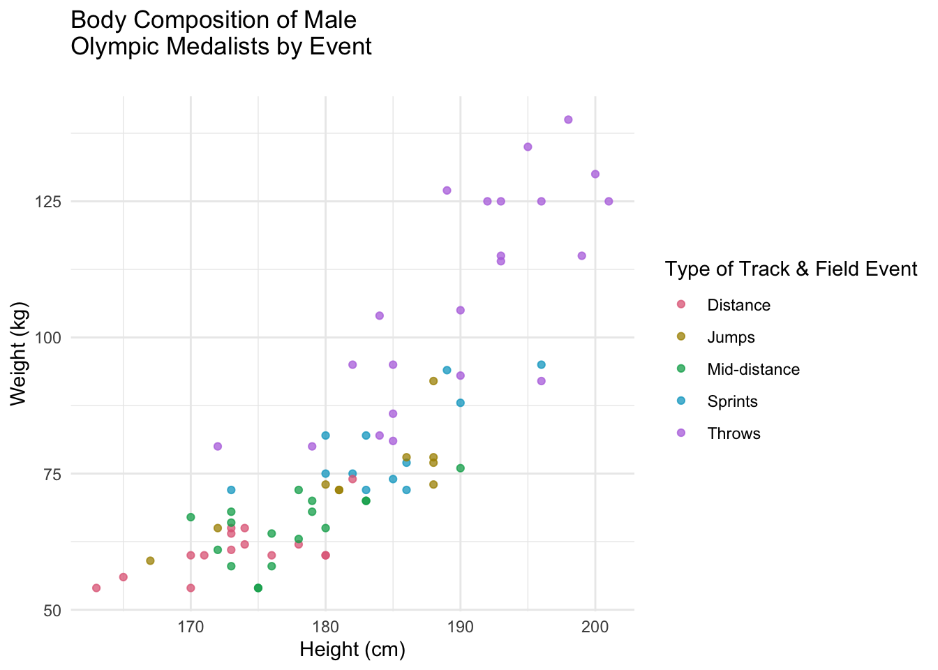 Similar patterns emerge among male Olympic medalists. Throwers dominate the upper right quadrant, indicating their tendency to be taller and heavier than other athletes. Like their female counterparts, male distance runners tend to have lighter and shorter body compositions. Jumpers and sprinters showcase comparable body types, with mid-distance runners falling between short sprinters and distance runners.
